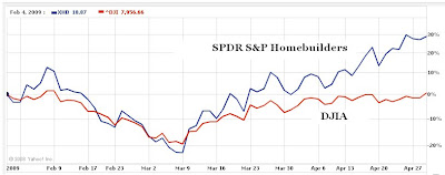 After several years of punishment, the U.S. homebuilding industry has begun to show some glimmers of hope. Earlier this month, The National Association of Home Builders reported its confidence index to be at its highest level since October. This optimism has pushed shares of the SPDR S&P Homebuilders ETF (NYSE: XHB) 18.3% higher during the past 4 weeks. Record-low interest rates and an $8,000 tax credit for new home buyers have been key factors to the XHB rebound.MP: Since the early March low, the SPDR S&P Homebuilders Index is up by 67.4%, and over the last three months it's up by 30% vs. 0% for the Dow Jones average (see chart above, click to enlarge).