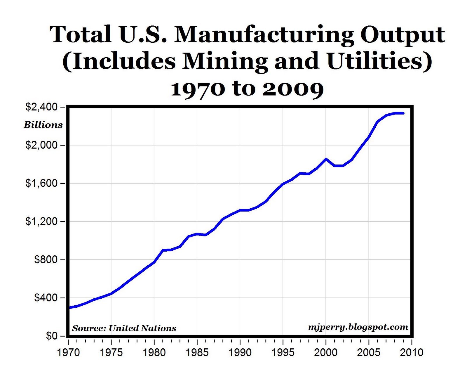 How can this be a crisis? The decline in manufacturing jobs has been very steady over the past three decades. At the same time the total number of jobs in the U.S. has steadily climbed. Total income and wealth of U.S. has continued to rise. And total manufactuing output in the U.S. - the value added by manufacturing operations in the U.S. - has also steadily climbed.